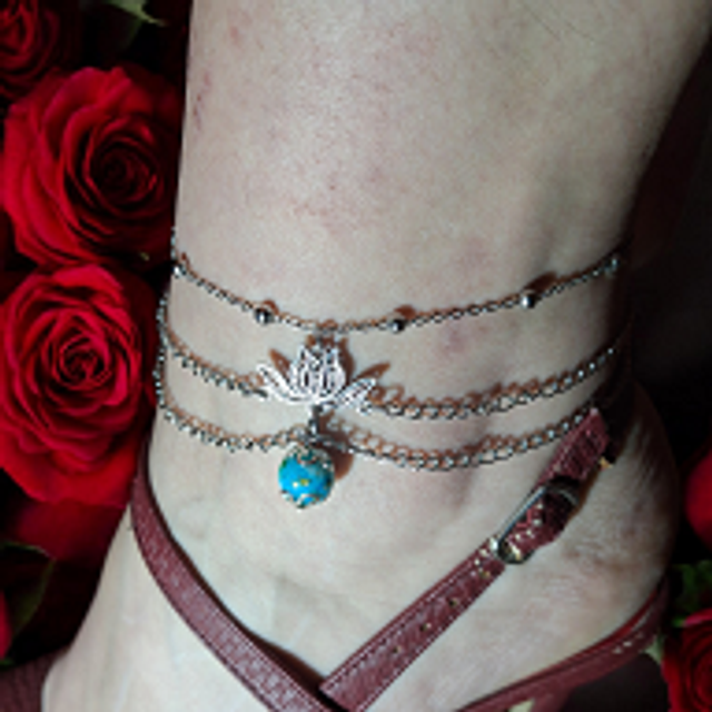 Bracelet de cheville délicat composé de chaînes en acier inoxydable, orné d’un pendentif lotus et d’une perle en verre turquoise aux reflets dorés. Le lotus représente la renaissance, la pureté et la force intérieure, tandis que la perle turquoise apporte une touche de couleur lumineuse et apaisante.