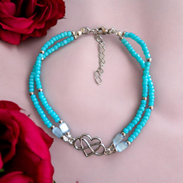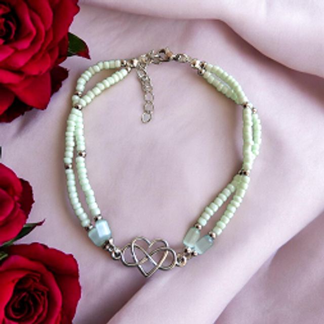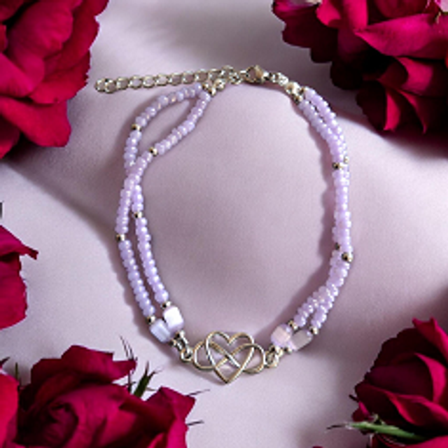 Bracelet de cheville délicat composé de deux rangs de perles en verre et d’un pendentif central cœur infini, symbole d’amour éternel, de lien fort et de continuité.