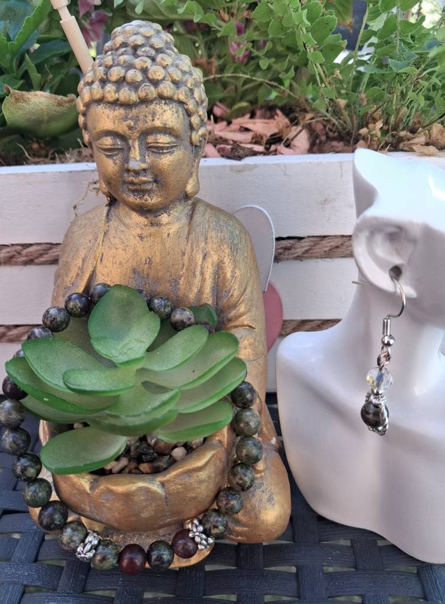 Pour chaque bracelet acheté, une paire de boucles d’oreilles pendantes assorties (pierres naturelles + perles de cristal, acier inoxydable) est offerte.